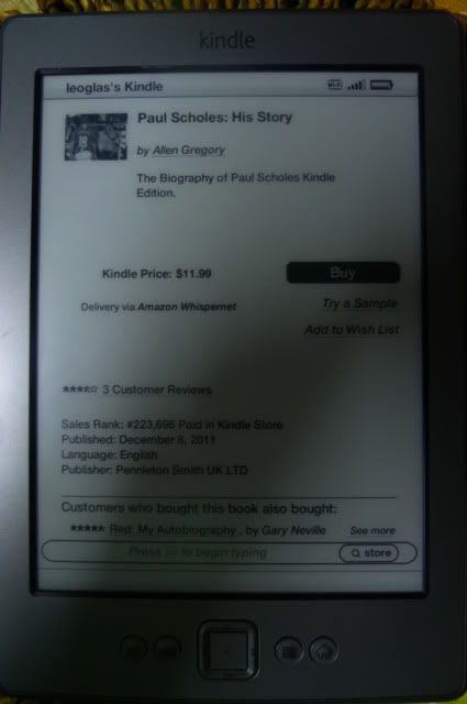 kindle 4 最方便的地方,就是可以隨時隨地上Amazon 買書,Paul Scholes 的自傳成了我在amazon買的第一本書。