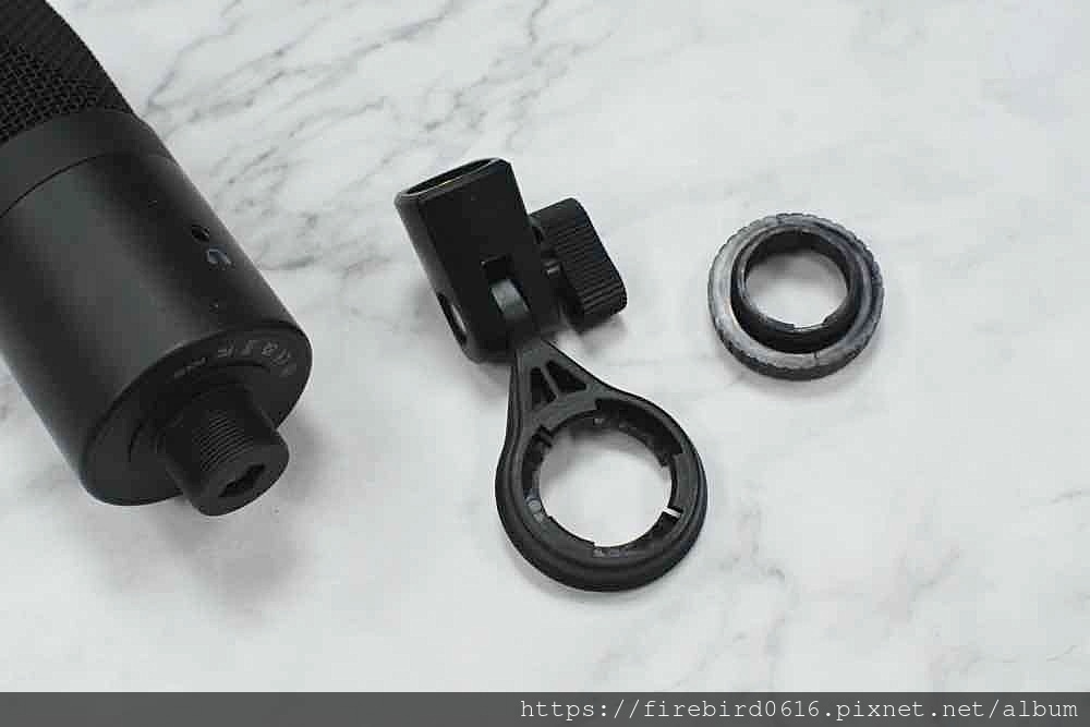 如果要套上防震網式支架,就必需要點步驟。首先要把麥克風從轉接環上轉下來。