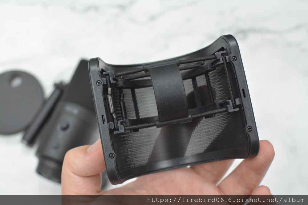 朝轉接環中間的地方向下按,再施點力向下向外壓,,就可以將轉接環下方的固定環完全取下,將K683B套入防震網,再鎖上固定環即可。