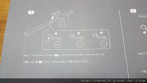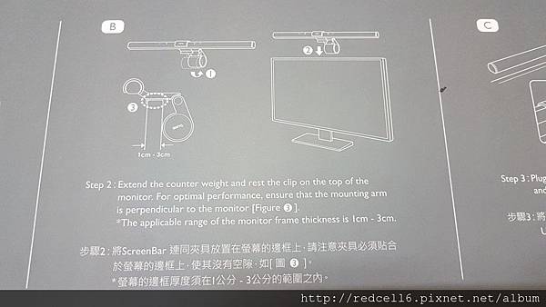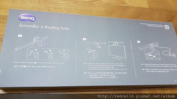 【▼】BenQ WiT ScreenBar螢幕智能掛燈外包裝背面有圖文對照的安裝說明。