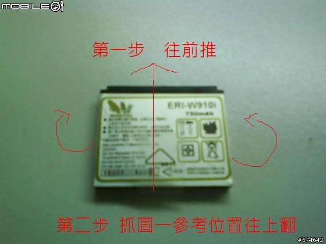 我來回答大大的問題囉 !首先先恭喜入手w910i!關於電池蓋的開法如下圖:(PS我手邊沒有相機且原廠電池正在服役所以以W910i和副廠當作參考) ↑正副廠位置都一樣↑1。抓住這裡↑2。照圖一的方式!抓住那個凹洞! 之後電池往前推!再用手把剛剛握的地方翻起來!就OK!希望機大大能夠看的懂!︿︿!