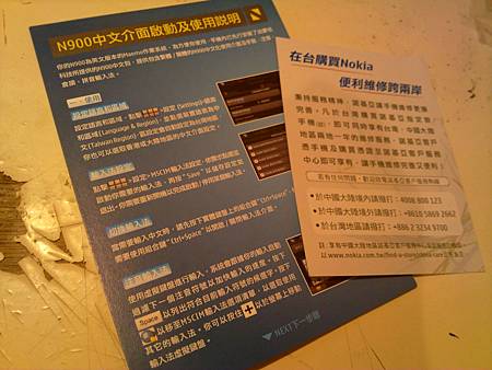 用戶指南就像是硬體及基本教學;MyNOKIA會員通知則是跟其他NOKIA手機會附的東西一樣,告知你有個網頁是會員用的,沒什麼用;操作手冊可特別了,裡面附上一些基本要有的軟體程式下載方式及介紹,下載整本手冊內的程式後,N900會變很強,不過要變更強光靠這本手冊還不夠就是了。