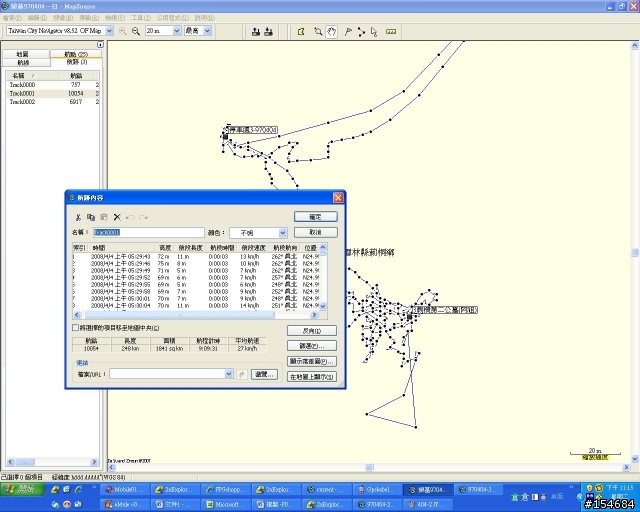 bryantai wrote:請問src11987...(恕刪) 我也是用NUVI350,配合3800記錄軌跡從3800下載的檔案是*.nmea利用gpsbabelGUI-2軟體轉為*.gdb,再用mapsource讀出以下是4月4日南下掃墓的軌跡(在車上車充有接MIN USB供電給3800)下車時用充電電池,上車用MINI USB(充電電池不用取出)也可利用軌跡定出航點,如下軌跡裏什麼資料都有,如下(時間,經緯度,高度,速度.....)