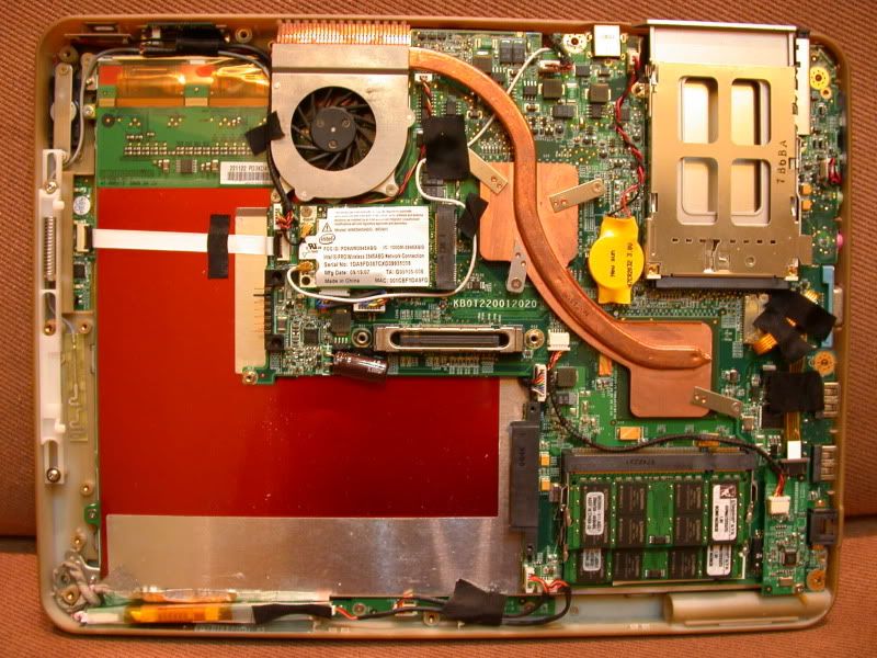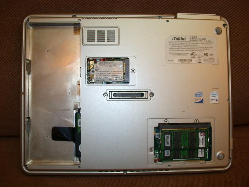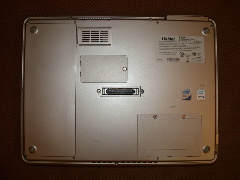 背面圖,左邊是電池,上面是散熱風扇出風口,出風口下是mini-pcie插槽蓋,正中央是擴充底座的接頭,右下是記憶體插槽蓋