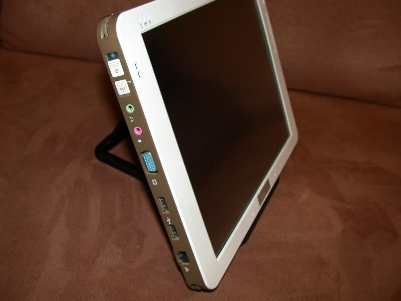 最上面為上下+Enter鍵,接下來是電源開關,藍芽兼無線網路開關,耳機插座,麥克風插座,VGA OUT,兩個USB,RJ-45,最下面為觸控筆收納槽