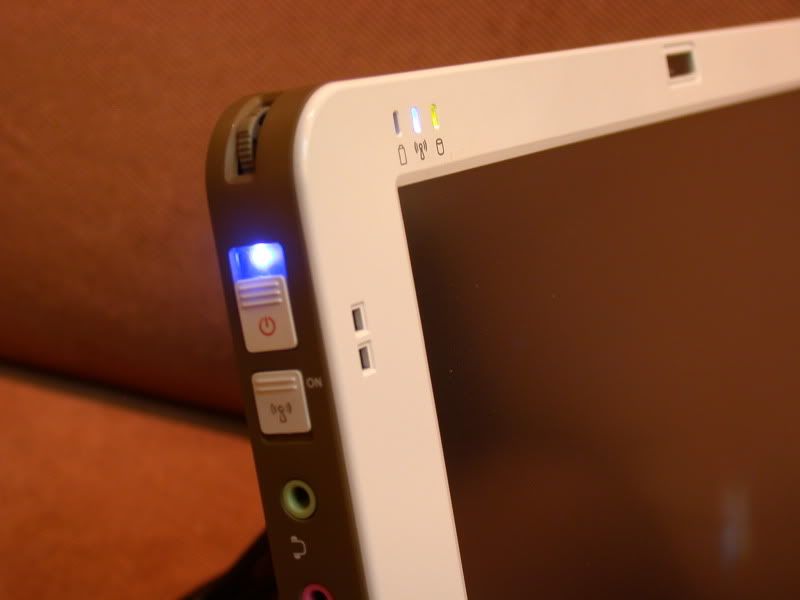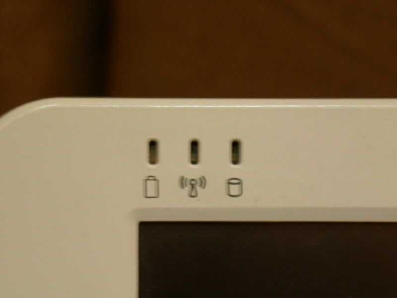 左上方是燈號指示,左邊為電池充電狀況指示燈,紅燈為充電中,綠燈為充飽,中間為藍芽兼無線網路指示燈,開啟時顯示藍燈,右邊為硬碟運作燈