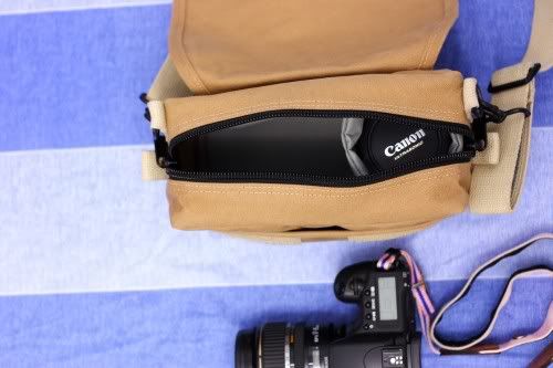 小弟用過好幾個LP包包,目前手上還有三個,先分享最小的75AW槍袋這是外觀打開後可見30D + BG-E2,剛剛好塞滿,上蓋內面的小袋子裝記憶卡與拭鏡紙把30D擺到一旁,可以看到接的鏡頭是EF24-70,遮光罩倒裝翻開兩片小翅膀,右邊放的是偏光鏡,左邊是直角觀景器,還有快門線在更下面掀開中間的隔版,底下還藏一顆SIGMA12-24,不過得打橫放才容的下前面的口袋可以塞進580EX(絨布袋子是另一顆外閃的),數顆三號電池還有兩顆BP-511(放區臣氏牙線棒盒剛剛好)最後,75AW與內容物大合照,這樣的配備適合背出去逛街另外,如果接小小白這樣長度的鏡頭,就無法再放進其他鏡頭,得在旁邊加掛鏡頭袋