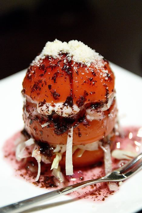 牛蕃茄,外面淋的是梅子醬,裏面包優格,上面灑起士.相當爽口.(ISO 800 F2.8 1/50sec).