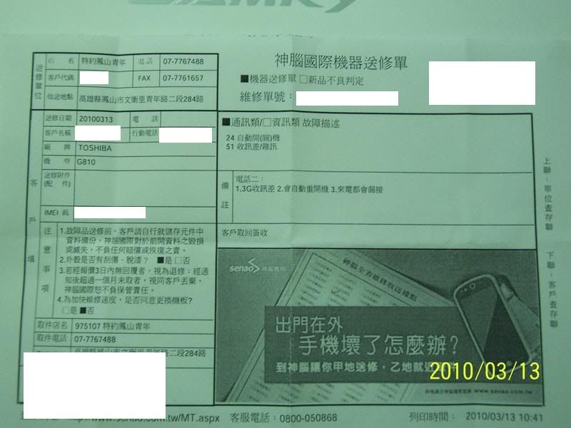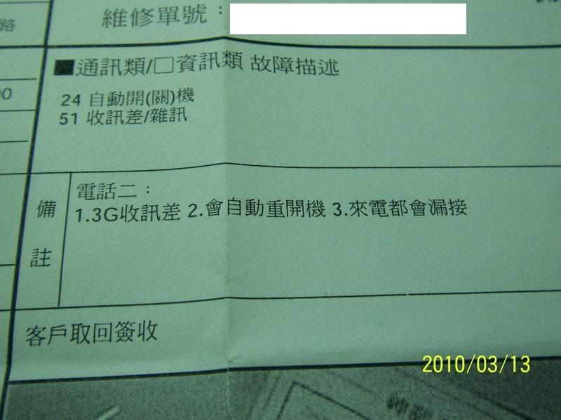 手機的3G訊號都很不穩定,都給他斷斷續續的跳阿跳(這些也都可接受拉)不過今天早上發現3G訊號收不到之後就給我自動從開機了(火大)~接著也陸陸續續有同學跟家人說你電話怎都不開機..你在幹麻等等之類的話(更火大)~~~看見很多網兄說這手機可能是機板的問題~所以我也就拿去神腦給他修看看了~~BUT~再簽完名後回到公司我發現~~他在是否同意更換機板部分給我勾否啦(這....我要去跟他說我要換機板嗎@@)請看以下圖~~@@ ~~~~完了 一個不小心害我現在小鹿亂撞