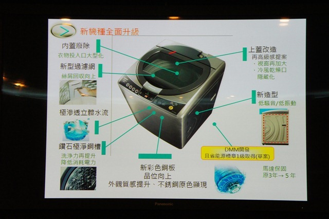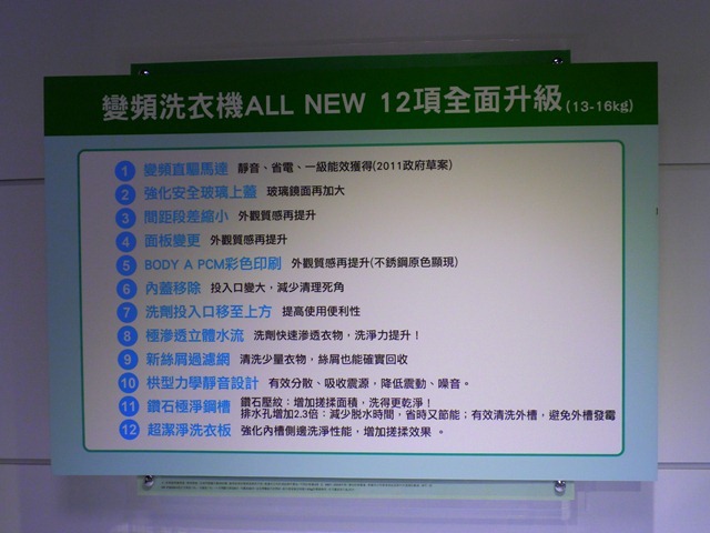 新款ECO NAVI直立變頻洗衣機技術升級部分,藉由工作人員說明,讓大家了解這12項技術升級部分,與舊技術的差異,以及會帶來的好處及效益。