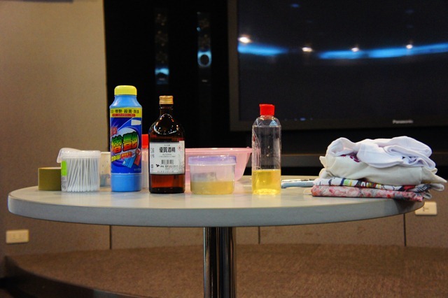 洗衣達人現場準備的示範道具。其中,在去污部分使用的物品,都是一般人家中會有的物品。