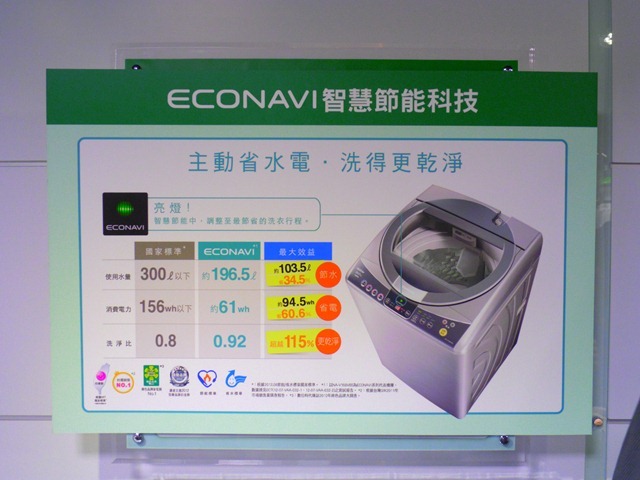 新款ECO NAVI直立變頻洗衣機,在每公斤衣物的耗電量、用水量,都符合政府單位規定的標準之下。
