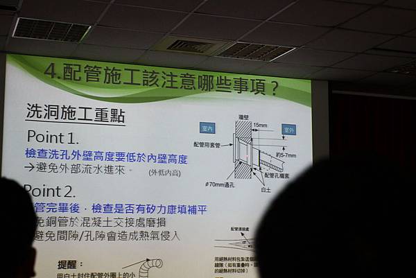 接著 這個洗孔的部分,真的就是眉角了! 要傾斜的並非是全水平的,而且傾斜的角度還是室內高於室外的才可以,這樣才不會有外牆的雨水順著洗洞孔逆流回來!!