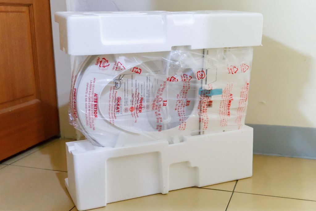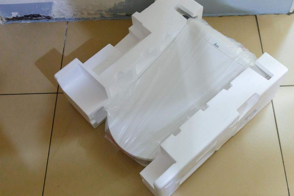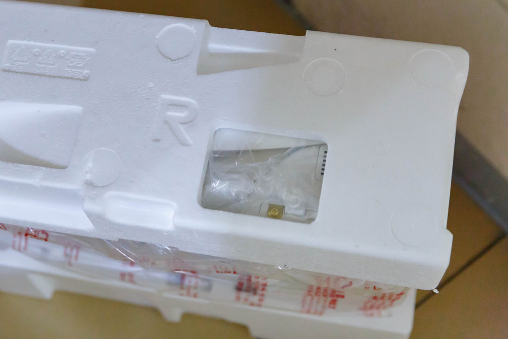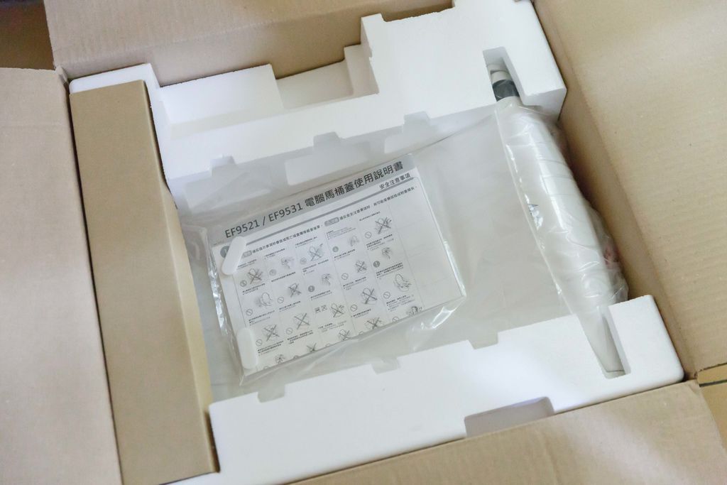 一打開的樣貌,電腦馬桶座被保麗龍好好地保護著,舊款是用紙板做的內襯,感覺上保麗龍得防護力才好。