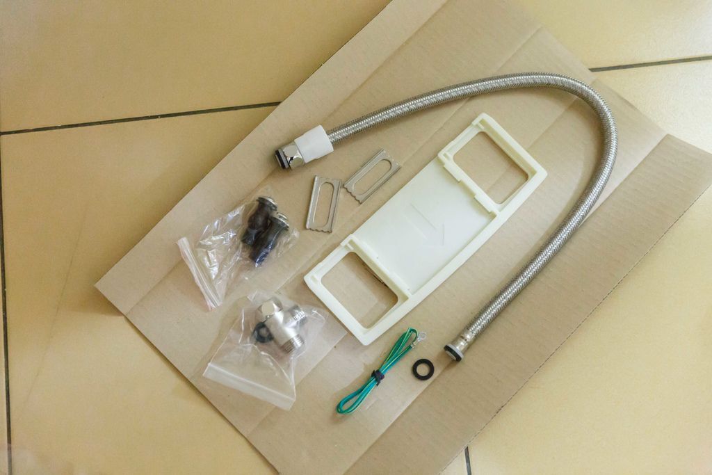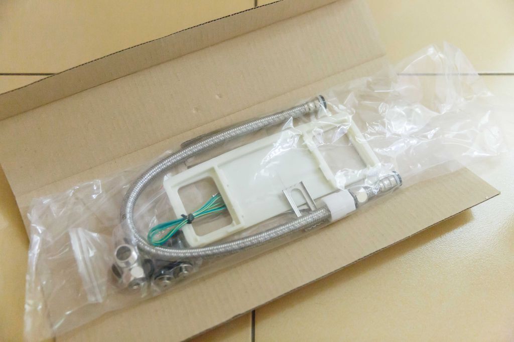 零件包-拆開,進水軟管、固定板、調節片、接地線、膨脹螺絲、三通。