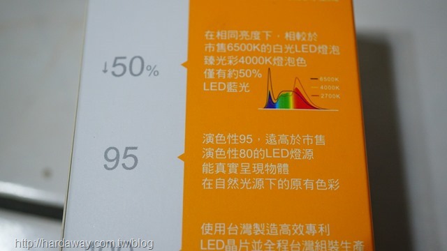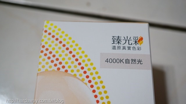 那什麼是德國巴斯夫臻光彩技術,這部分在外盒側面有簡單說明,也就是這項臻光彩技術,能將LED光源演色性提升至新的高度,同時維持極佳光效率。而呈現4000K自然光臻光彩LED燈,能提供使用者最真實的色彩,所以適合在住家、辦公室、彩裝、美術、展覽…等空間使用。