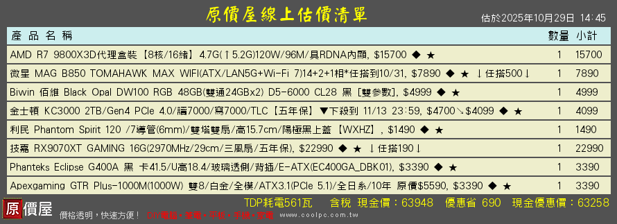 | 中央處理器 | 【散熱器放大術(黑暗)】AMD【8核】Ryzen7 9800X3D+全漢 MP7 BLACK | 1 | 16,490 |