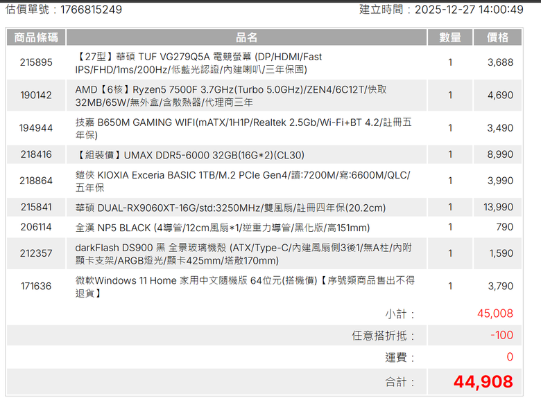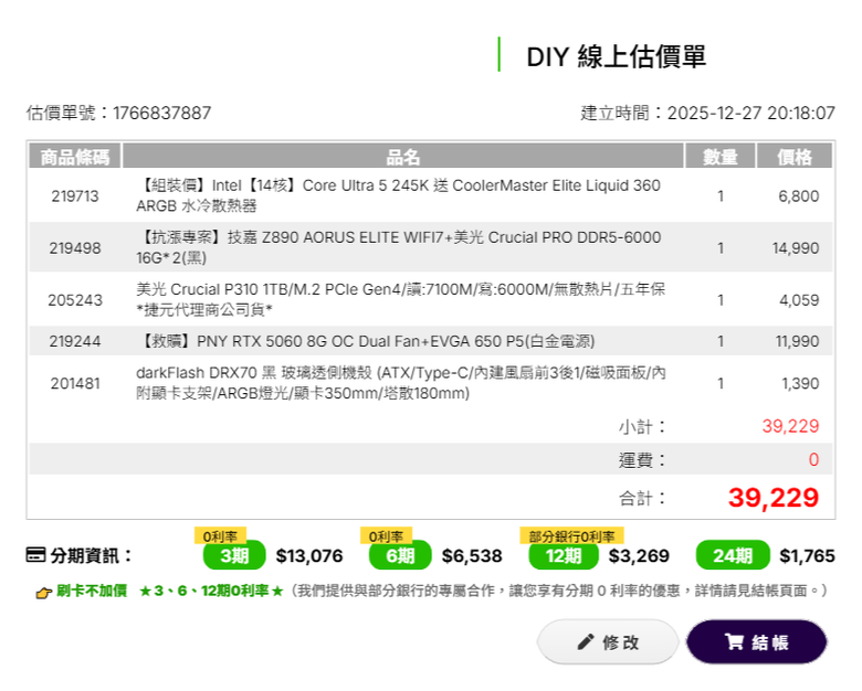 樓主貼的單已經有一陣子了,現在記憶體跟SSD又更貴了