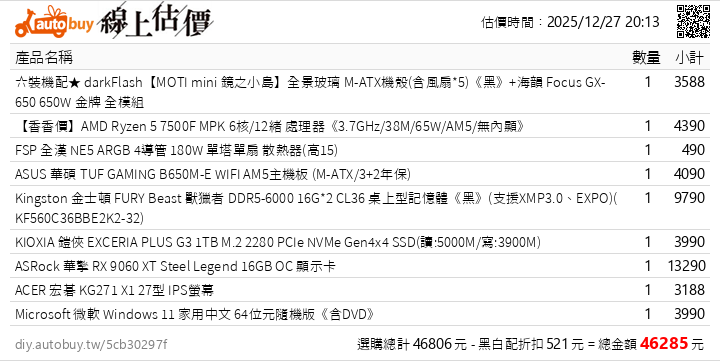 電供就9060XT加上7500F來說,不需要抓到850W,用650W就足夠了。7500F搭塔散可以用單塔。MB跟顯卡都選五年保的比較好