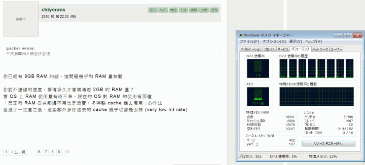 開分頁才10~30個,還好啦這個部分你的記憶體有4G、8G或16G,瀏覽器的吃法不一樣基本上對瀏覽器來說都是多多益善,很可能開同樣的分頁,裝越多吃越多我自己是用Firefox的分頁群組,所以隨便都會超過50個但實際上現在不管是Chrome還是Firefox,佔用記憶體的狀況都有改善真正要擔心的很可能是硬碟…所以要嘛就裝SSD,或是拿一部分記憶體做RAMDISK對於你裝8G或16G比較有差的是VM,這兩三個VM可以開多少資源給他,就要看你實際上有多少能用如果跑Win7以後的OS,就算拿32位元的也要1.5G RAM,64位元基本就要2G,除非你是拿來玩Container,那可能用不到那麼多因此還是建議裝16G,可以有比較多的規畫。