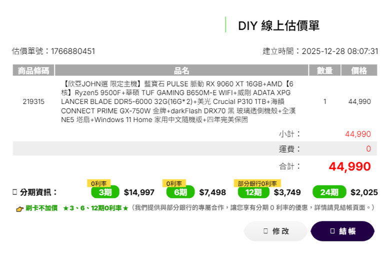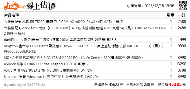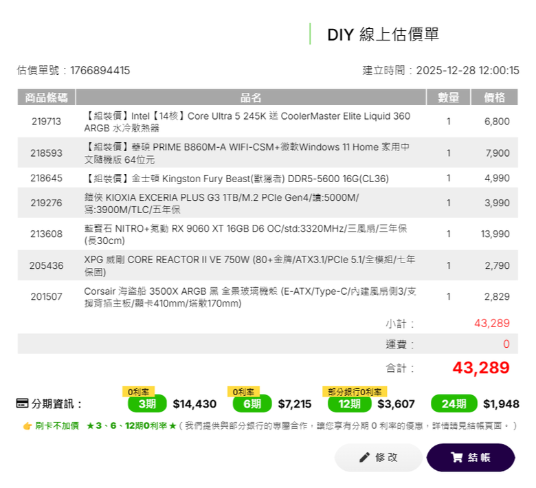 43K 只有16G 板子搭系統,245K 搭酷碼360水冷有優惠,除了RAM其他都可以買
