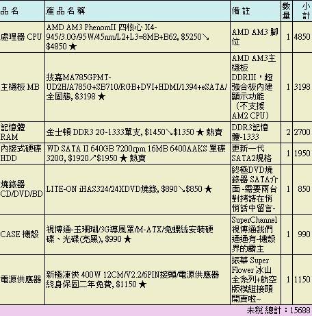 CPU AMD AM3 AthlonII X4-620MB 微星 760GM-E51RAM 創見JETRAM DDR3 2G-1333 X2HDD 日立 SATAII 500G燒錄器 先鋒 DVR-S18L/22XSATA燒錄器VGA 微星 N9600GSO MD512 Classic DDR3CASE CoolerMaster RC330POWER 康舒 iPOWER- 430(足380W)/12公分未稅 總計:14970