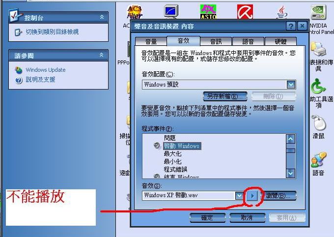 大致上 問題是..window系統音效沒聲音 開關機 警告聲 清空垃圾桶 等等的音效都沒有聲音包含msn yahoo即時通 也是都沒音效flash沒聲音 MID格式無法播放右下角音量圖示用不出來不過播放東西 mp3 影片 玩遊戲 一切都正常重新安裝過很多次音效驅動程式 都沒改善跟我情形一樣案例電腦系統音效即時通+Flash無聲+不能錄音win沒有音效flash沒聲音Windows XP開關機和msn都沒聲音?電腦開關機沒聲音..