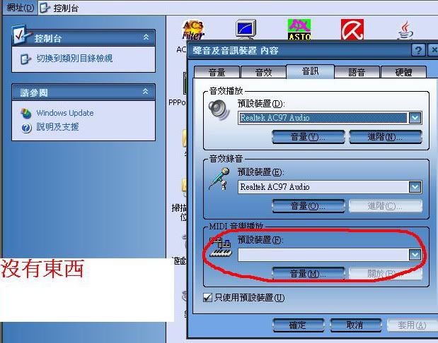也不是完全沒聲音 感覺要透過系統發出wav就發不出來用播放程式去放就OK上面倒數2張空白的選項 其實有東西可以選就是原本的音效裝置 但是選了 按確定再打開一次 又變成空白了~有點像檔案設定成唯讀不能改這樣..........
