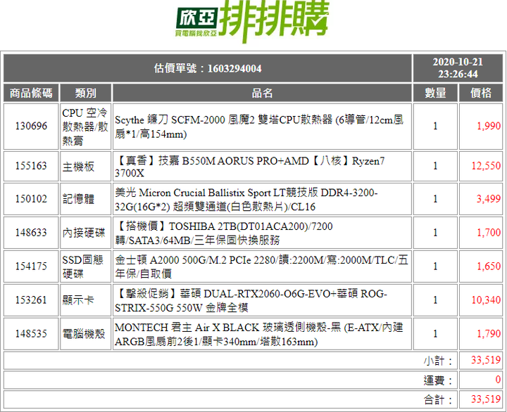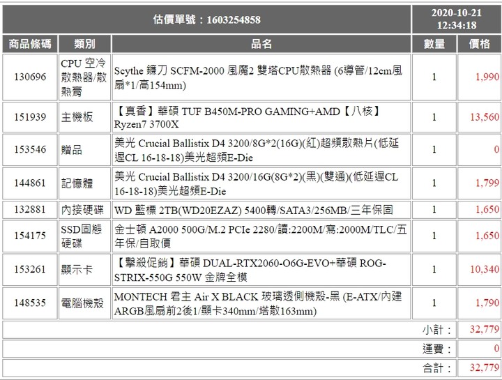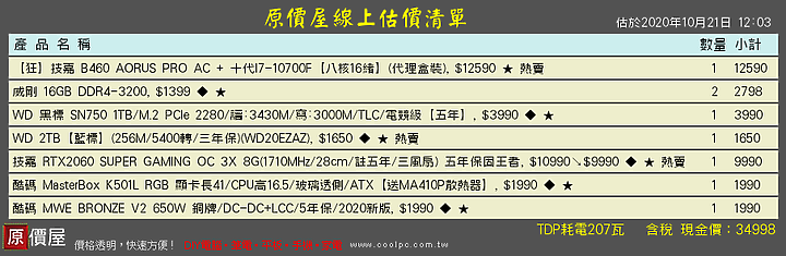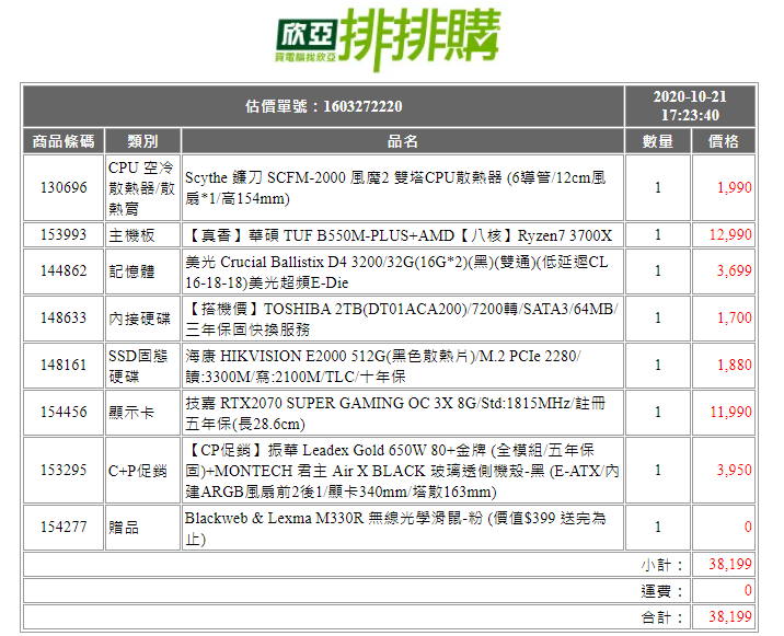 主機板/機殼樓上說過(不相容板沒需求不用太高 (B550就夠電源太高了 (轉換效率會較差要配固態碟才快 (差好幾倍速若會玩別的遊戲顯卡可以高點處理器一樣 3700 (塔扇一樣配風魔2)有搭板子 華碩 B550M TUF /五年保記憶體配 美光 16Gx2 超頻/低延遲顯示卡升 技嘉 2070S 三扇/五年保固態碟用 海康 512 含散熱片十年保傳統碟配 東芝 2TB 有快換/搭機價電源可配 振華 650 金牌全模五年保有搭機殼 AirX ARGB 網孔/雙20CM扇有送滑鼠這樣 38K