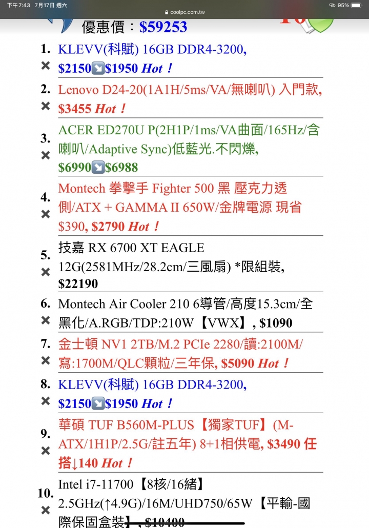 logantibo wrote:預算:50-60K(...(恕刪) 一個2k 165hz 27吋螢幕+24吋1080p。機殼可以另外挑自己喜歡的,只是大概會比較貴。然後顯卡我建議自己去店家問問有沒有丐版(18900$)的3070ti,更快更便宜。