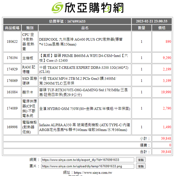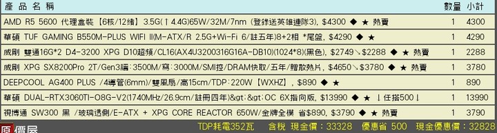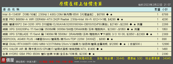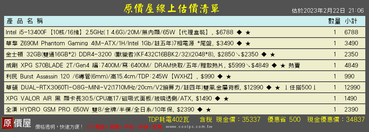 gear2318 wrote:各位好 沒組過電腦請...(恕刪) SSD 你要 2t 的話, 那個價格其實也可以直接上 gen4 了ram 沒特別便宜沒理由拿 CL22 的35k 不含 os, i5-13400f, 32g, 3060ti板子拿 5 年保 z690, SSD 上 gen4, 機殼看個人喜好35k 不含 os, i5-13400f, 32g, 3060tiSSD 改單條 2t, 散熱上 ba12035k 不含 os, i5-13400f, 32g, 3060ti需要 wifi 的話改這樣40k 不含 os, i5-13400f, 32g, 3070