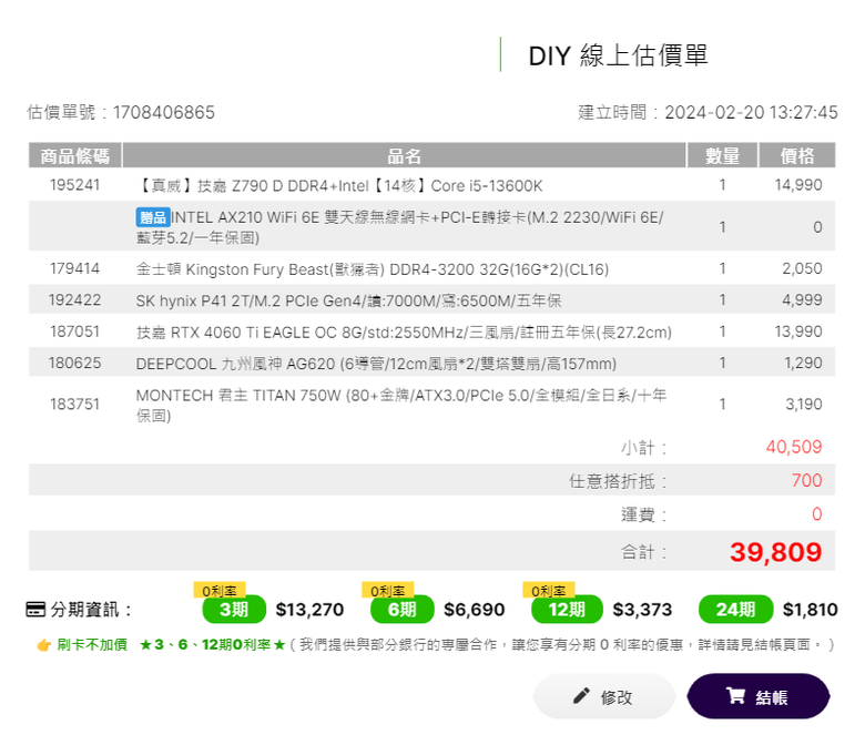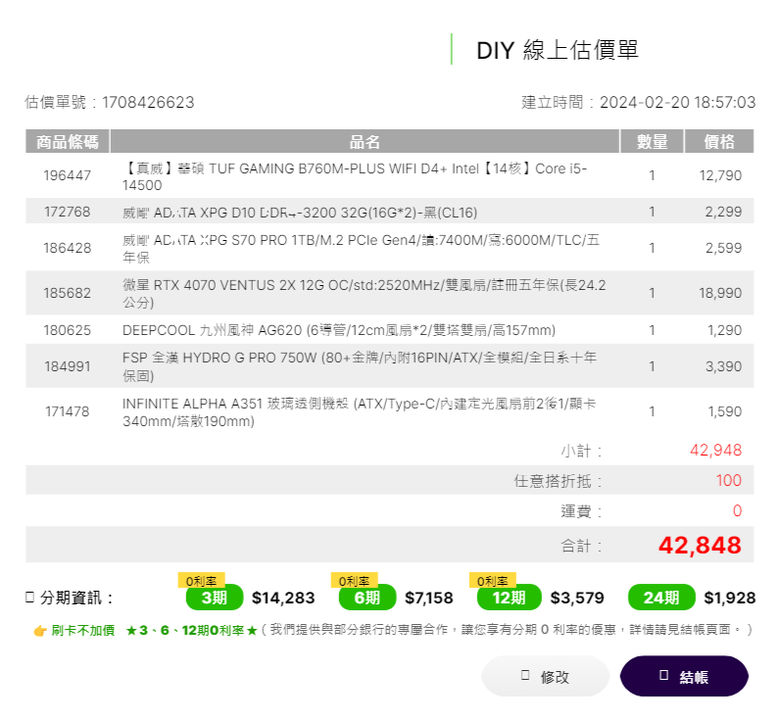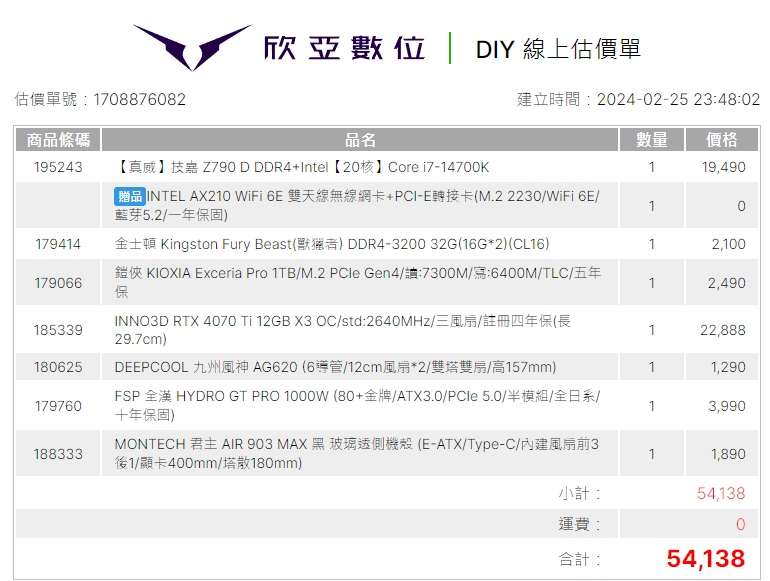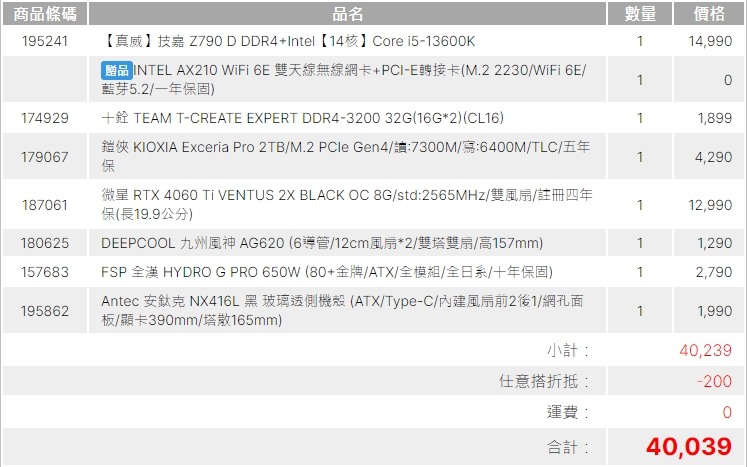 【 需求 】:遊戲/製圖方案一:目前配備如下,預計更換配件CPU跟顯卡,可能瓦數不夠會再更換電供方案二:重組>預算35000~45000更新:目前參照意見改成這樣(超預算一點點)再麻煩版友們提供意見,謝謝大家