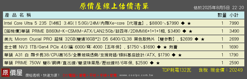 看到這裡不免想說, 按你的預算來看, 以下商品價格大幅溢價, 不建議購買:7700 MPK (散裝散裝散裝)9600X9700X以下是京東AMD直營店的售價, 寄回來台灣都比在台灣買划算, 個人也是在京東購買, 不認同用保固與售後來嚇人現今要買到合理售價, 符合看影片, 文書, 剪輯, 備有日後另外買顯示卡的硬體, 建議如下, 雖然個人不偏好INTEL, 但至少代理商夠誠意Ultra 200S 265K $7450Gigabyte Z890 Eagle Wifi7 $7990 -180記憶體: 到這裡買二手, 這價格還不賴 $2000https://www.mobile01.com/marketcommodity.php?id=2293796CPU Heatsink: 建議京東啟動, 在台灣通路買也是貴爆你, 我也是京東買來的, 建議九州風神AK620 @RMB 249M.2 SSD 微星Spatium M560 Gen5.0 1TB $2890海韻Core GX750 ATX3.1 $3290會爆預算到$25000