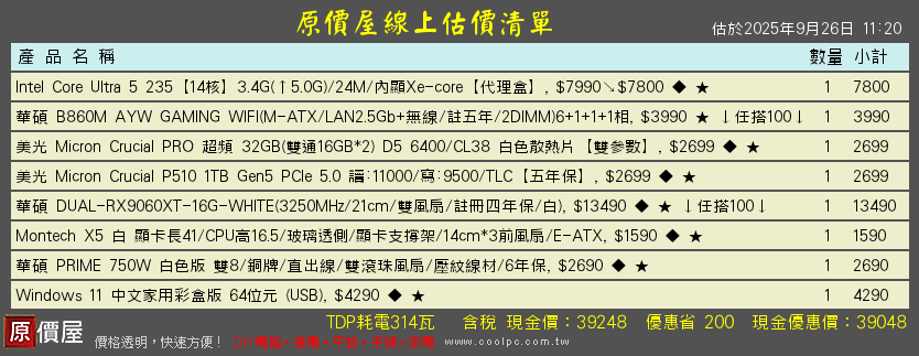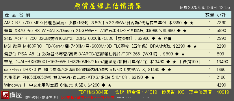 寶尼0205 wrote:想要四萬含作業系統組白色主機平常有開模擬器4開,一般上網、影片、玩遊戲看了大家的菜單自己配了一下 主機板拿用料更好X870八層板80A17相溫度更低,白化稅顯卡選華碩保固多1年同價7700MPK+9060XT-16G+CL30低延遲+M480PRO含OS更好的組合菜單!