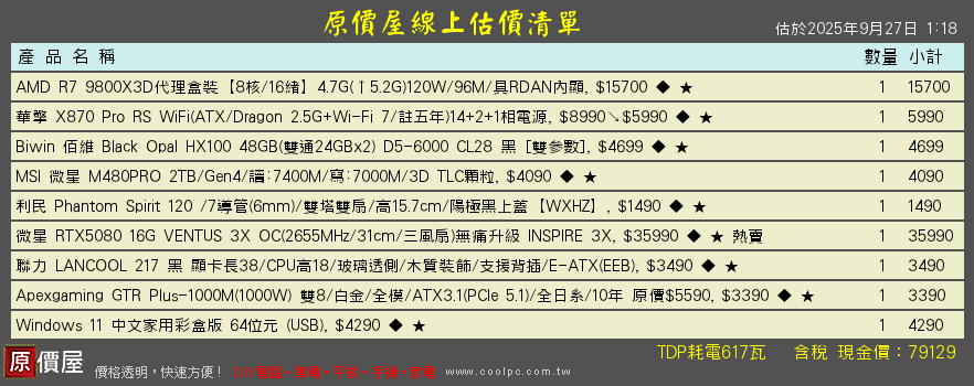 Heaven415 wrote:要組一台8萬左右的電腦(含作業系統),主要是以遊戲為主目前的配單如圖:請問還有什麼能更改的嗎 或有任何不妥的地方嗎再麻煩指教了 主機板拿用料更好X870八層板80A供電溫度又更低,不需360水冷散熱用雙塔即可9800X3D +5080 +CL28低延遲48G + M480PRO-2T +聯力217含OS的79K菜單!