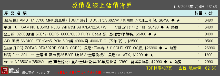 Cnew wrote:有沒有更省錢的組法? 更省改7700MPK +5070ti同價位用料最好保固更好 +CL30低延遲 +B850八層板溫度低高速低溫的SN8100 2T +NE850GM +CR601與Elite 301 Lite的62K組合菜單給你參考!