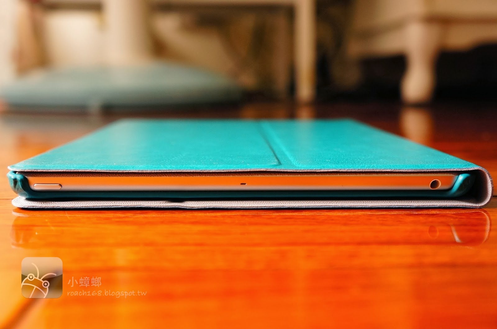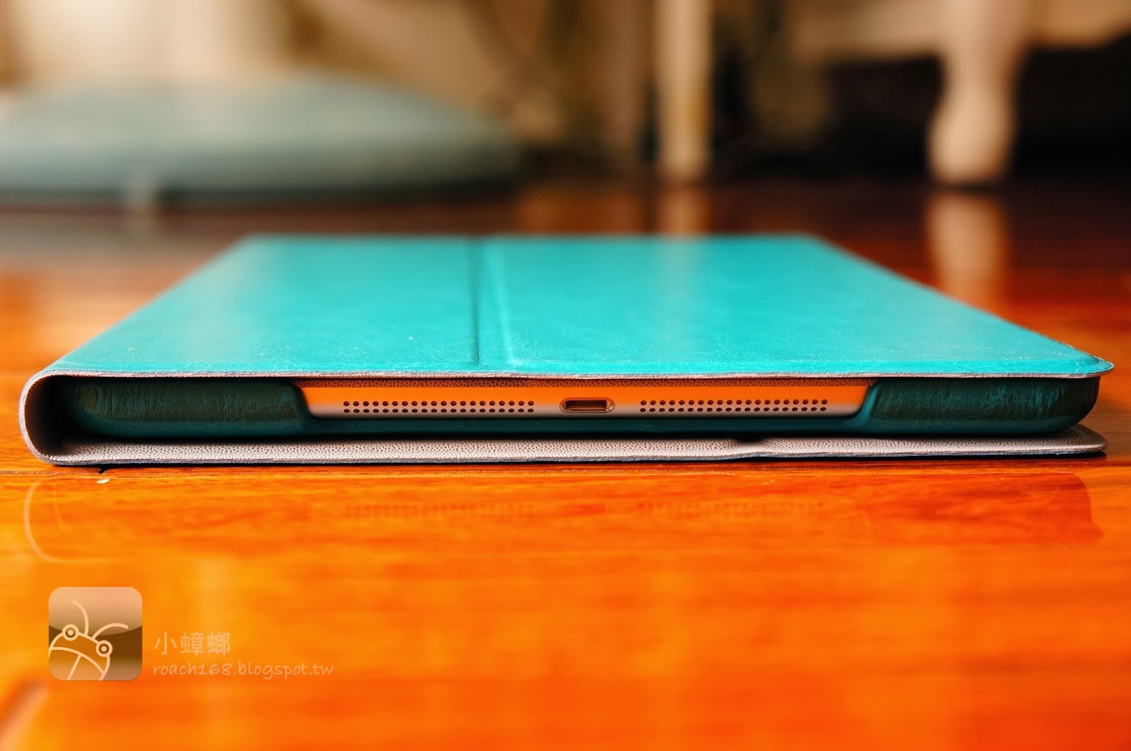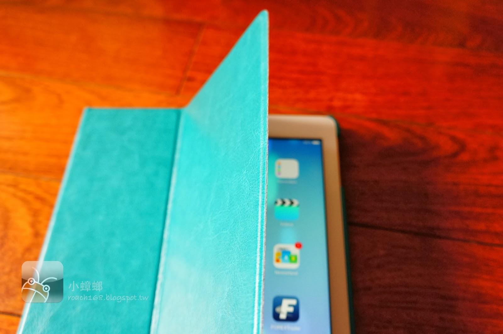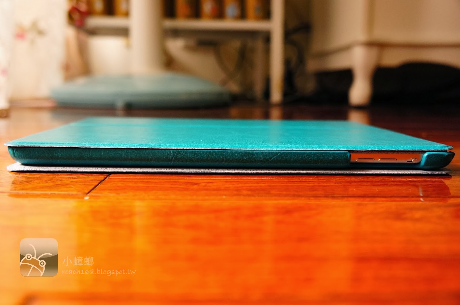 蓋起來的厚度也沒有增加太多,厚度大概12mm吧,拿起來比我之前iPad 3還薄,加了皮套也還能接受這樣的厚度