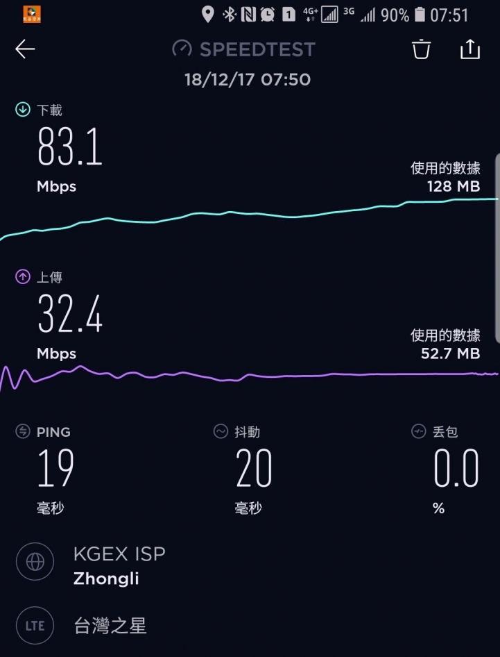 MonkeyKiss wrote:.台星全台均速也沒快21Mbps多少.(恕刪) 撇開限速這些爭議不談,光談速度的部分,台星現在戶外很多地方都4G+了,有4G+的地方,要跑個50Mbps以上不是難事..(它2600頻段基地台過去一年蓋不少)當然,如果您是用沒CA的手機,當我沒說!附上一張此時此刻,在公園運動隨手測速圖
