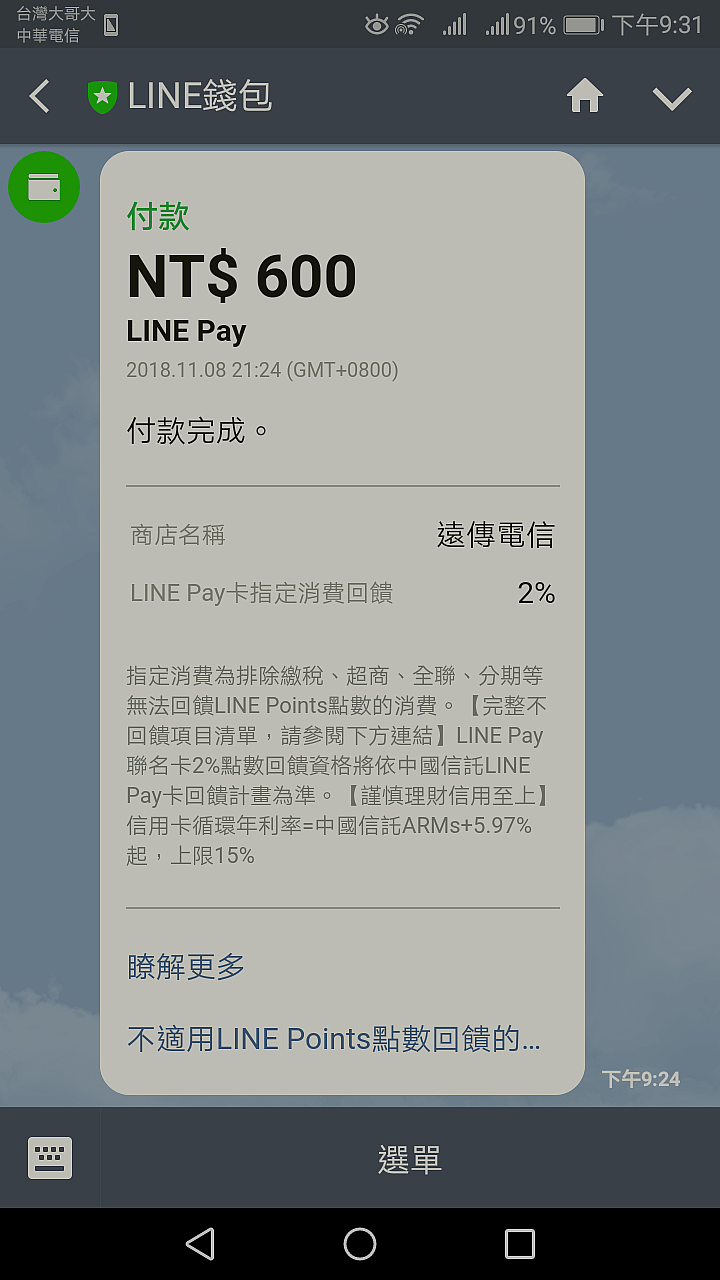 中華如意卡攜出 LM211 line pay扣line point 600點