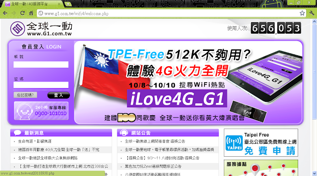 今天搭信義新幹線去看世界設計大展順便測試一下TPE-Free,果然!速度超快,不會像平常那樣卡卡的,不過可能太多人用了,第二次登入就登不上但我看到另一個iLove4G的WIFI,就很好連,也蠻快的,但他的入口網頁是全球一動就是,一般人要連上可能不知道帳密是TPE的帳密,這點也沒說清楚,不是很方便用。