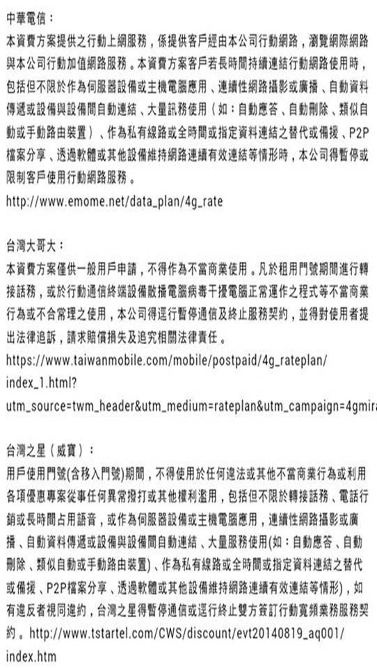 電信業者雖然宣稱4G上網吃到飽不降速, 但不代表不會控速(限制特定大流量用戶上網速度以確保其他用戶上網品質), 且有權可以暫停或終止用戶不當的使用行動網路服務