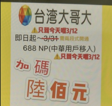 j808010 wrote:中華設計這個價格很明顯是故意的...(恕刪) 實情是:台哥大的門市幹了一件惹毛老大的事 - 「中華門號NP過來加碼600」,中華只是對開加碼優惠而已,那個促案原本是首年438/第二年488,短期限定區域首年388/第二年488,等於加碼600,回敬台哥大,檯面說是限定學生,實際上...