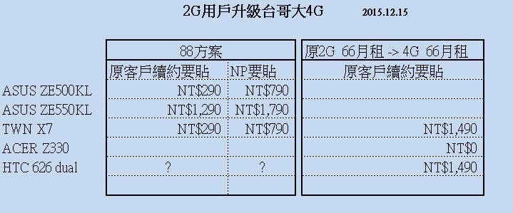 amo09 wrote:今天剛好去門市問了HTC的價格,不過因為我是要NP的所以不清楚原用戶的價格HTC 626 88元貼4790;188元貼4490請參考看看囉(恕刪) 呼呼~那你有跟店員詢問【政府購買4G手機補助2000在哪裡】?突然想到這次非電信商的小電信行,有人在退佣的嗎?