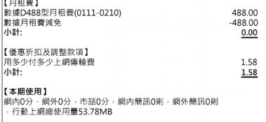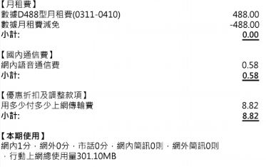 國標 wrote:累積到300元才會出帳單。...(恕刪) 我四月才收到9元的帳單在更之前收過2元的這零月租真的滿適合剛上國中的小朋友偶而跟同學出去聚聚...可以打打電話上上網平時都用家裡的網路比一般有月租費的還省很多