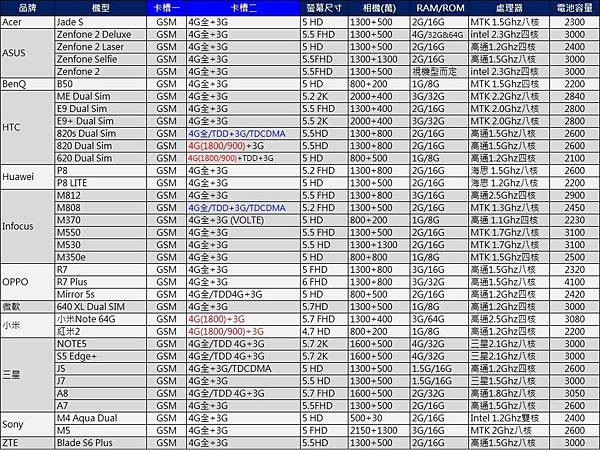 已有一篇很詳細的報導,有支援的手機清單也列出了,可以去看看。http://goo.gl/Uc30AsQ: 雙卡機是哪兩個通訊網路? 有4G + 3G ? 可以同時上網及通話嗎?A: 目前雙卡手機所使用雙門號的頻率大都是GSM+WCDMA(3G)、GSM+4G FDD/4G TDD/WCDMA/TD-SCDMA、GSM+GSM 、GSM+CDMA 、GSM+WCDMA、GSM + TD-SCDMA、GSM+PHS. 換言之,目前坊間的雙卡手機都是GSM(2G)+不同通訊網路,並沒有4G+3G、 3G+3G或是CDMA+WCDMA(3G)。就已曝光產品上市的訊息,ASUS ZenFone Zoom ZX550是目前手機業者唯一標榜將會推出4G+3G的機型,不過,該產品2015年初曝光至今,並未上市∘為何廠商不推出4G+3G、 3G+3G或是CDMA+WCDMA(3G)? 除了成本變高、市場需求不大、無經濟規模的原因外,據瞭解4G+3G、 3G+3G或是CDMA+WCDMA因頻率相近容易相互干擾產生技術障礙可能是遲未推出的主因之一。近期標榜全球首款雙4G雙卡旗艦平板的 HUAWEI MediaPad X2,其實與三星Note5/HTC Desire 820s Dual Sim一樣只是支援4G FDD/TDD雙模,但仍是4G+2G的雙卡手機∘因坊間的雙卡手機都是GSM+不同通訊網路(4G/3G),所以不能兩個門號同時上網。再者,目前坊間銷售的雙卡機大都是「雙卡雙待」手機,並無法兩個門號同時通話,需選擇具「雙卡雙通」的手機方可支援兩個門號通時通話。