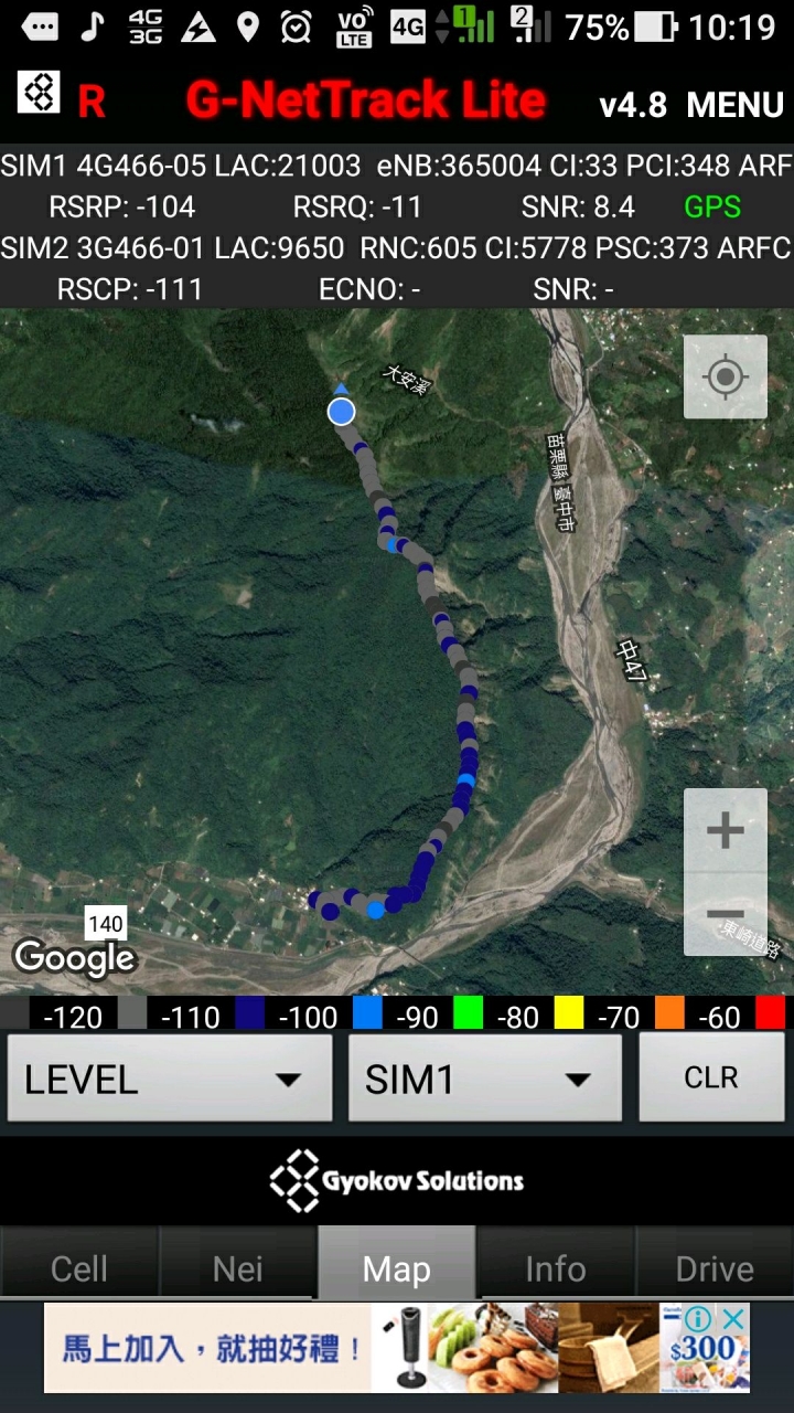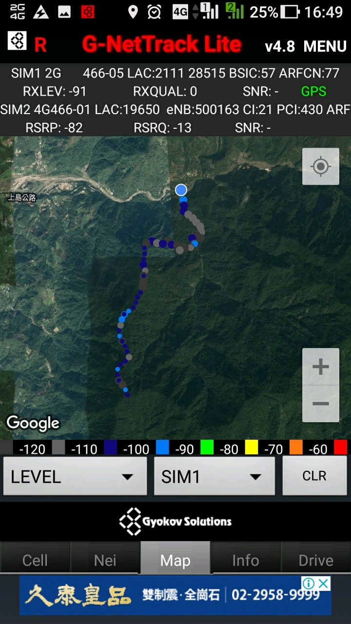 今天不爬山改騎車跑山136線台中太平一江橋→赤崁頂→半路店→九九峰→霧峰奧山登山口→霧峰分局。亞太電信PK遠傳電信,外卡中華電信。訊號強度:亞太電信勝遠傳電信。4G灰色-110訊號還很強,相當手機訊號兩格。3G灰色-110訊號微弱或無訊號,手機顯示X無訊號。SIM1亞太電信,4G訊號強度在灰色-110差不多手機兩格,-120深灰色訊號微弱或無訊號SIM2遠傳電信,3G訊號強度在灰色-110,手機無格數無訊號。赤崁頂,亞太&遠傳赤崁頂,中華,訊號不穩時有時無。九九峰旁,亞太&遠傳,圖SIM1應該是466-05亞太電信才對,如下訊號強度圖。訊號強度九九峰旁,中華