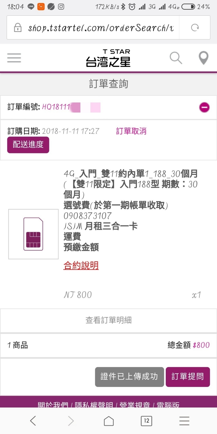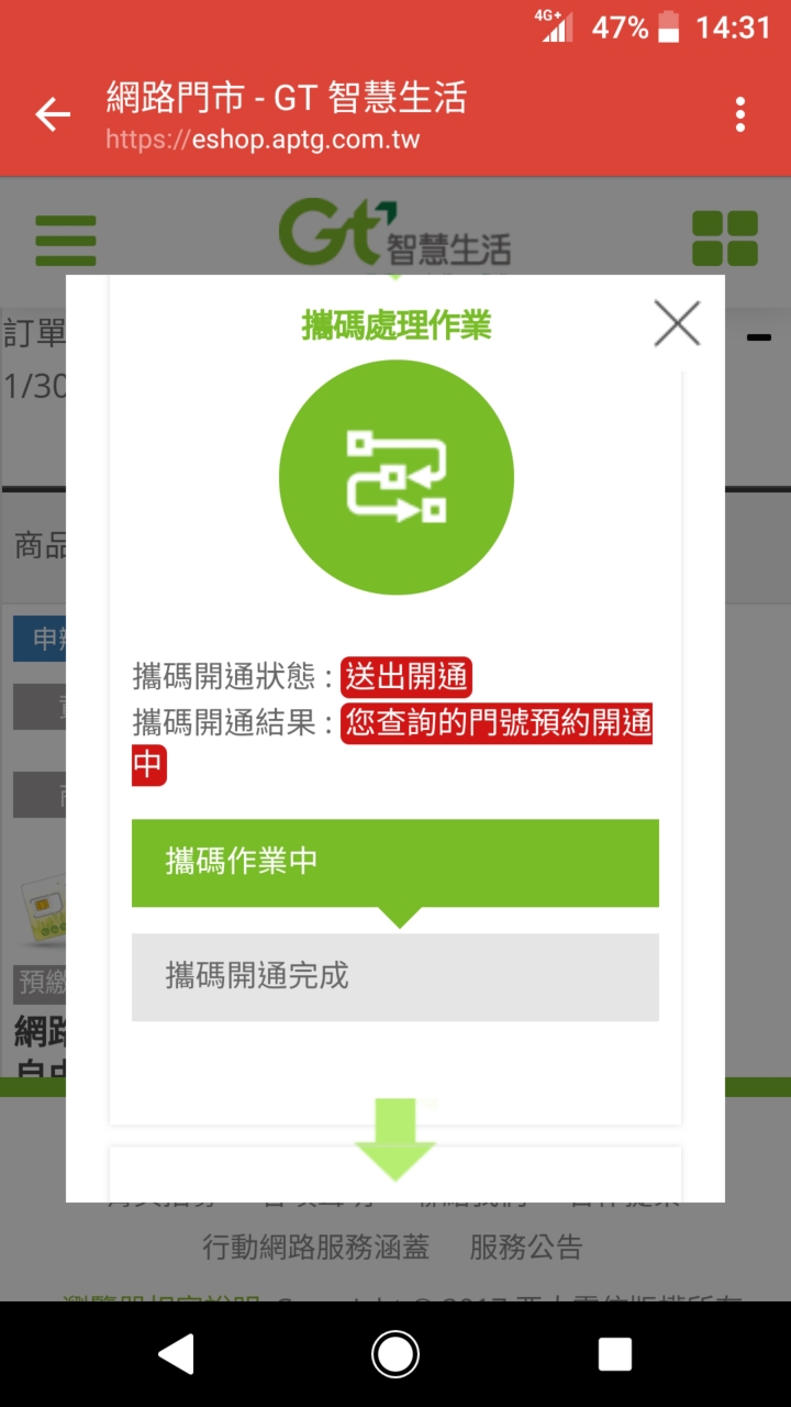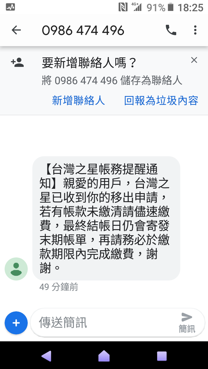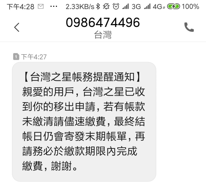 孤舟一帆渡 wrote:先來簽到吧,等LM1...(恕刪) 標記一下,我LM111今早到,用起來比台星訊號好太多,網路超給力等我解約完成再來PO單,解約金上禮拜說940,覺得還好138>111,月租更低,速度更穩又快台星掰掰,一個雙11,搞的一肚子火,列入永久黑名單12/5更新已攜碼亞太,台星簡訊就不貼上來了,只複製文字部分【台灣之星帳務提醒通知】親愛的用戶,台灣之星已收到你的移出申請,若有帳款未繳清請儘速繳費,最終結帳日仍會寄發末期帳單,再請務必於繳款期限內完成繳費,謝謝。至於LM111網速部分,切換頻段後,全部跑好跑滿,真是比台星好用太多太多了