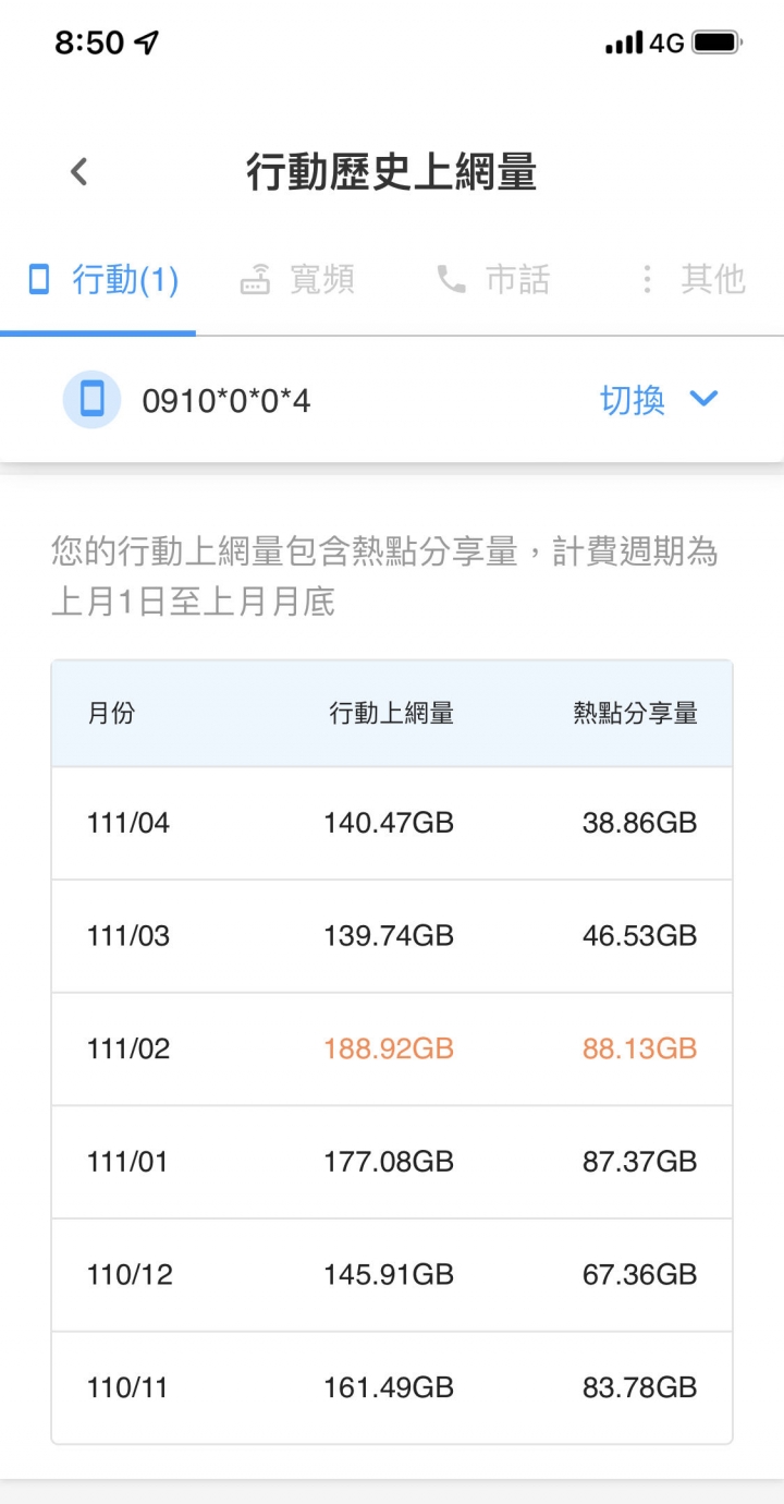ctstsk wrote:我剛查差不多6.99G(恕刪) 打手槍不需要用腦,就不會用到破百的....流量單位是GB TB Byte,不是G (通訊界是指Generation)你差不多6.99GB,因為你家裡有WIFI,工作地點有WIFI我家裡沒WIFI,2隻小孩也跟大人一樣499吃到吐我月均100~120GB,怎用,平時晚上/週末沒出門時......1. 看球賽直播(iPad/android機),2. 同時看中天(android機),3. iPhone就Line/Whatsapp4. 筆電....看網頁,或同時開YT(政論節目)背景聽就4台用1條線,100GB不難