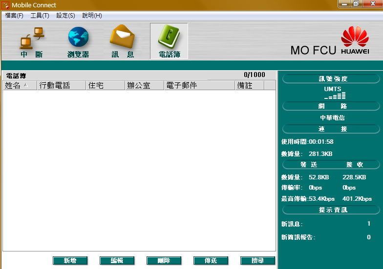 上周五興致沖沖的拿我買ASUS筆電的兌換卷去換1元的E220沒想到今天上班使用後發現居然在B1只收的到GRPS的訊號3G完全沒格我是在台北市基隆路靠台大這邊耶天阿= = 中華電信讓我失望了馬上打了0800去客訴希望過幾天會有改善....用GPRS傳輸只有30Kbps