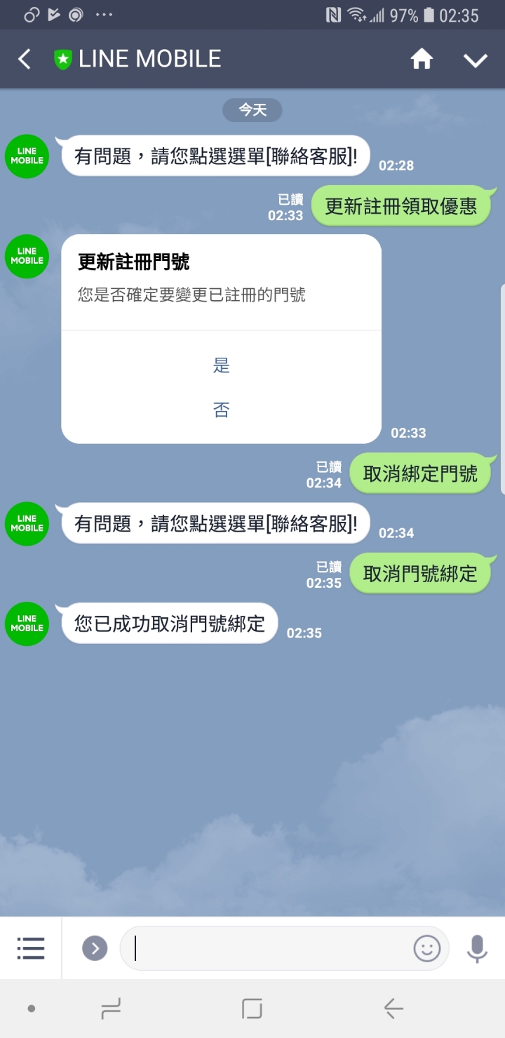 問題來了,也不知道哪根筋不對,突然想改在原本的line帳號(帳號A) lm官方帳號綁定新門號,於是手一滑就把新註冊的line帳號B整個刪除...